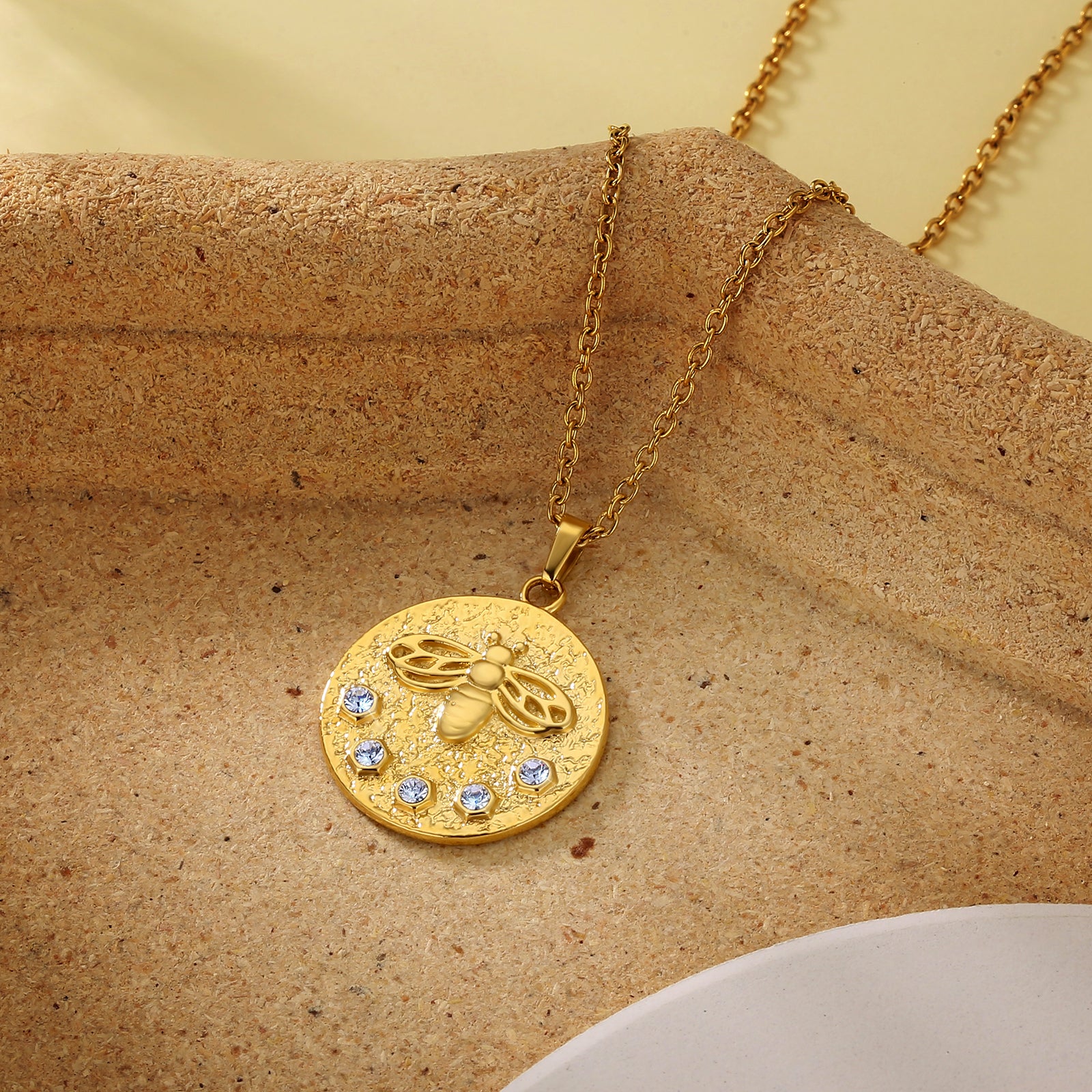 • 【独特なデザイン】立体的なデザインが程よく存在感を持った、上品なコインネックレスです。ペンダントには、なめらかな円形に5粒のキュービックジルコニアが埋め込まれており胸元を華やかなに飾ります。上品な輝きのマットゴールドが大人の雰囲気です。蜜蜂(ミツバチ)モチーフは古代ギリシア時代から「縁起の良いもの」として愛されてきたそうです。蜜蜂モチーフには、勤勉・純潔・知恵・豊穣という意味がこもったシンボルでもあります。