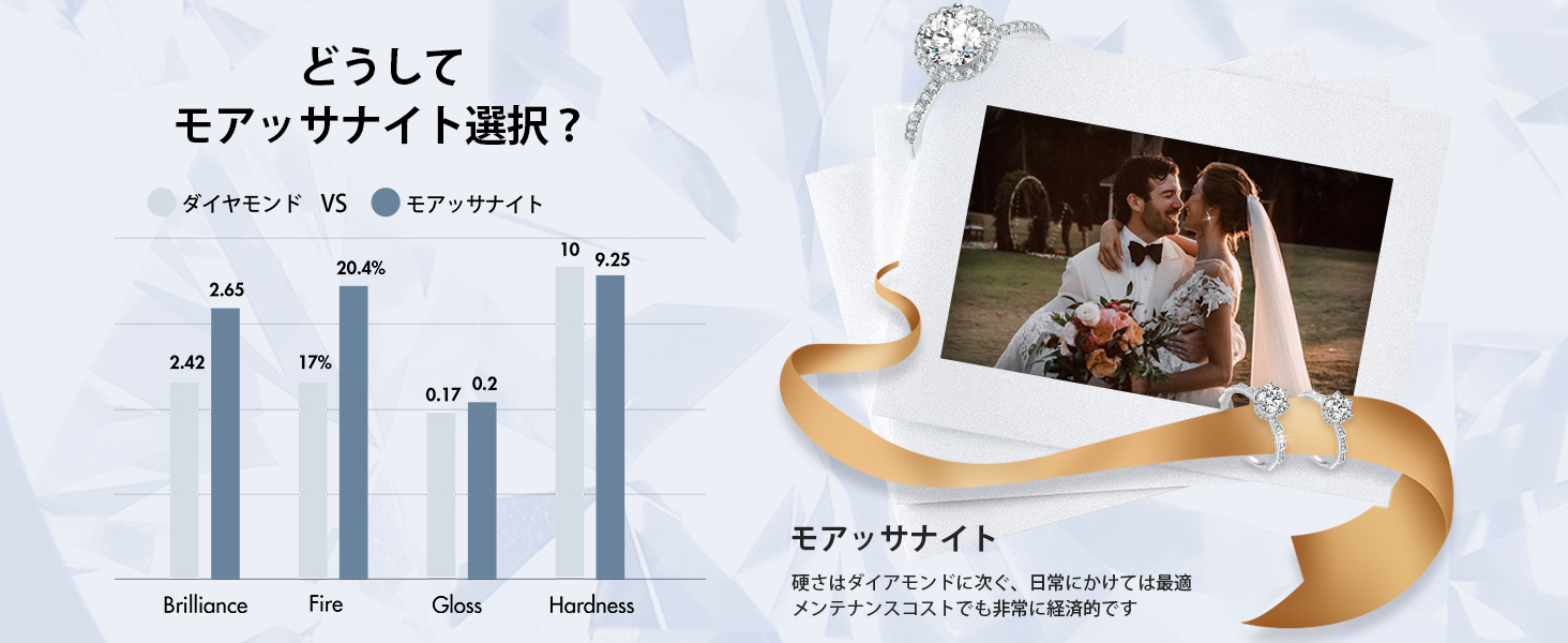 天然ダイヤモンドの数倍輝くと言われている世界で最も輝く鉱石モアサナイト(別名:モアッサナイト)。無色透明であり、ダイヤモンドと硬度がほぼ同じで耐久性が非常に高いモアサナイトは、世界が注目する次世代の最先端の宝石。ダイヤモンドは皮脂との親和性が高く曇りやすいのですが、モアサナイトは親和性が低く素晴らしい輝きが持続します。米国では、ダイヤモンドよりも輝き、約10分の1の価格で購入できるモアサナイトが婚約指輪・結婚指輪としても非常に支持されています。